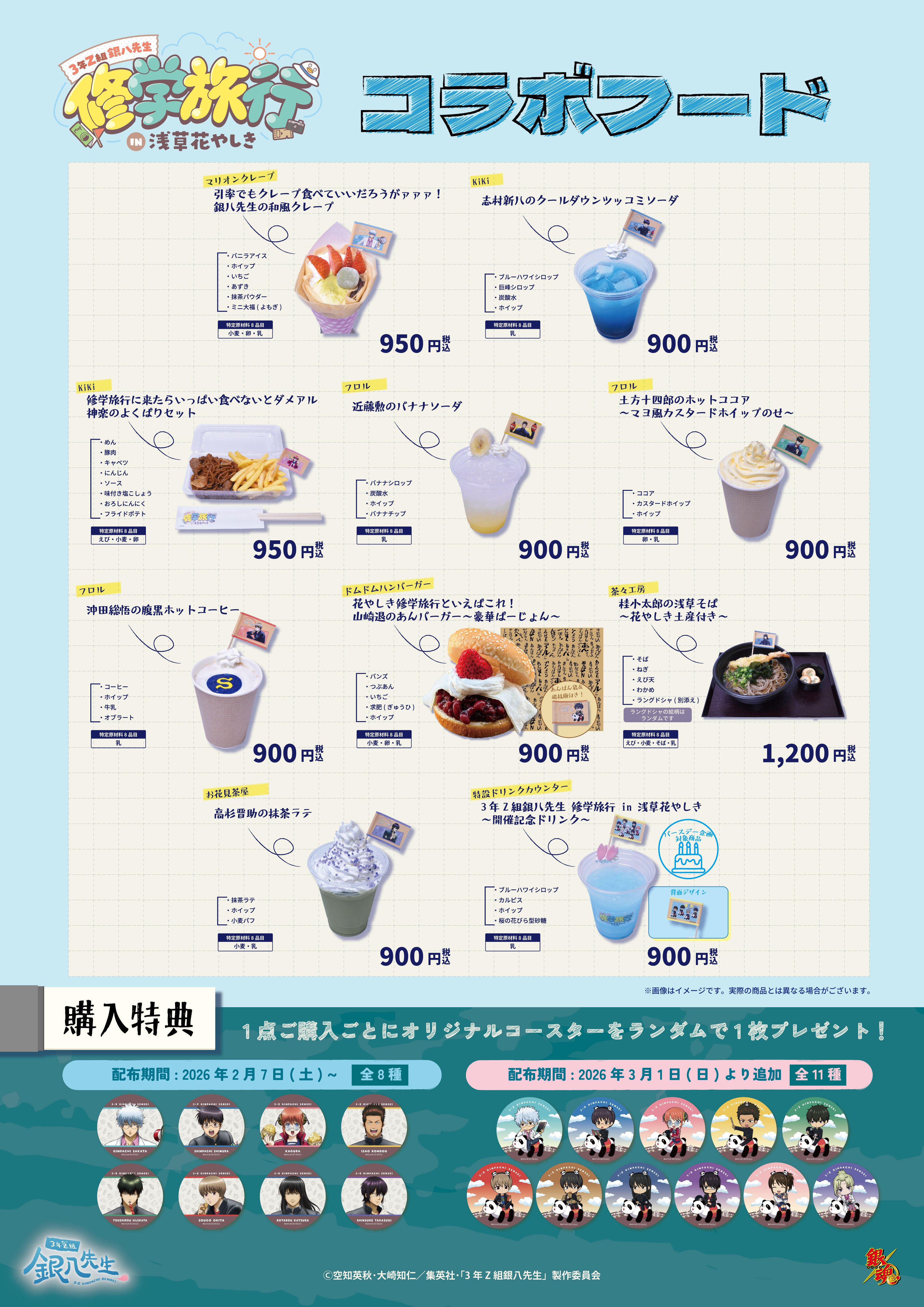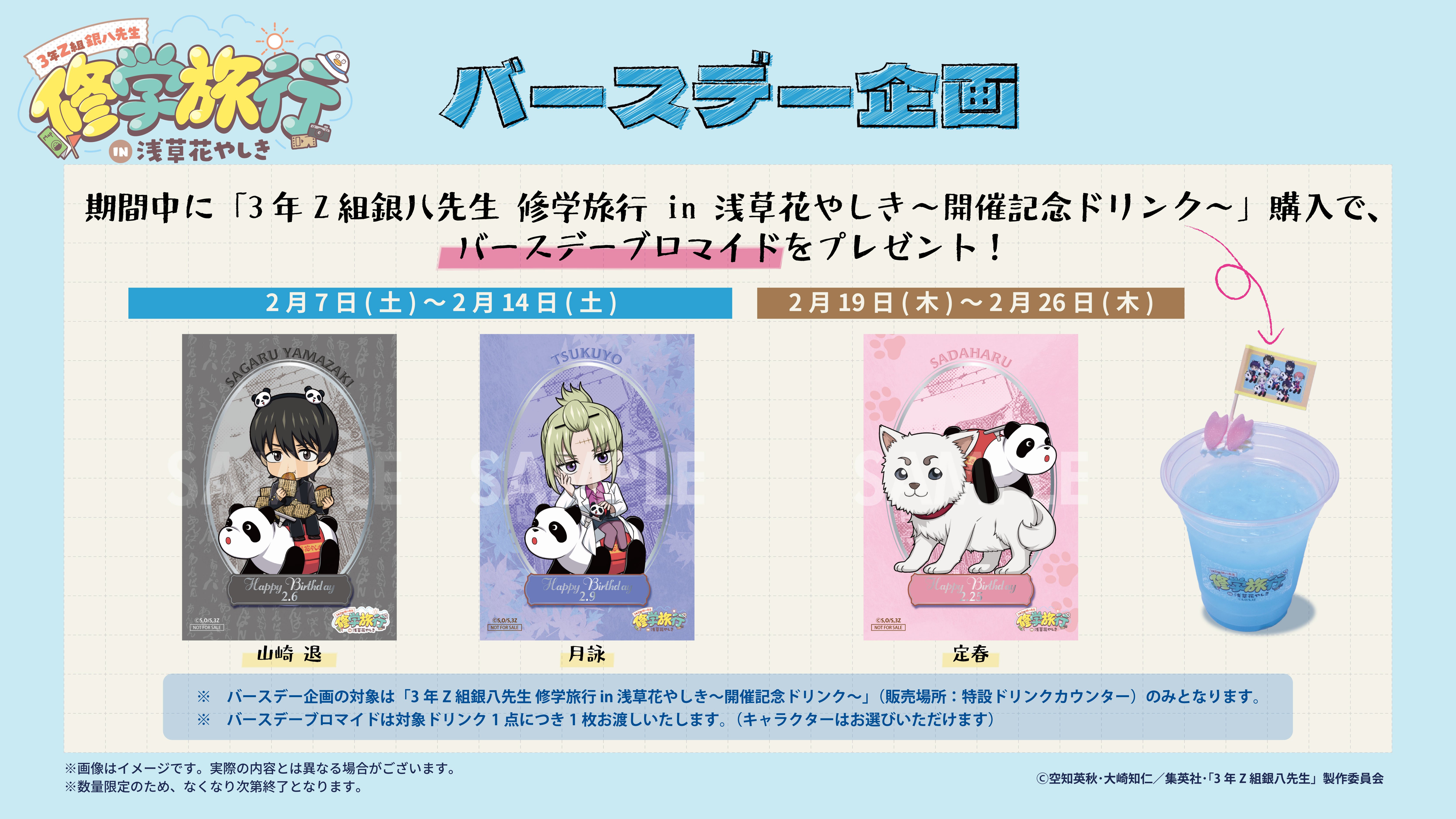 上記期間中に「3年Z組銀八先生 修学旅行 in 浅草花やしき~開催記念ドリンク~」を購入いただくと「バースデーブロマイド」を1枚プレゼント!