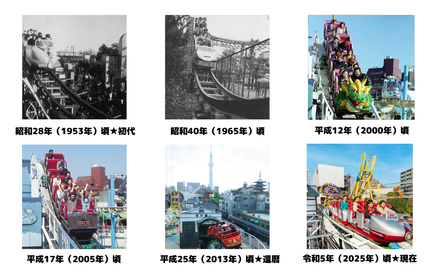 花やしきのローラーコースターは昭和生まれ!昭和28年(1953年)、日本初のテレビ放送が行われたのと同じ年、花やしきに「ローラーコースター」が設置されました。日本現存最古のローラーコースターです。当時最先端のロケット風のデザインと、新鮮なスリルが人気を博しました。その後、ドラゴンや千両箱の形など変わり種も経て、現在は誕生当時を再現したロケット風の形に戻っています。